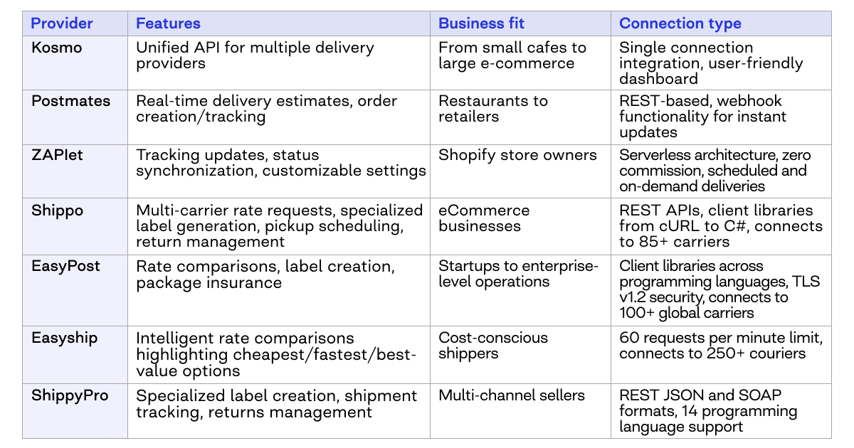 Beyond general capabilities, each logistics API provider offers standout features that set them apart. Here's what makes each option distinctive in the crowded logistics technology landscape.