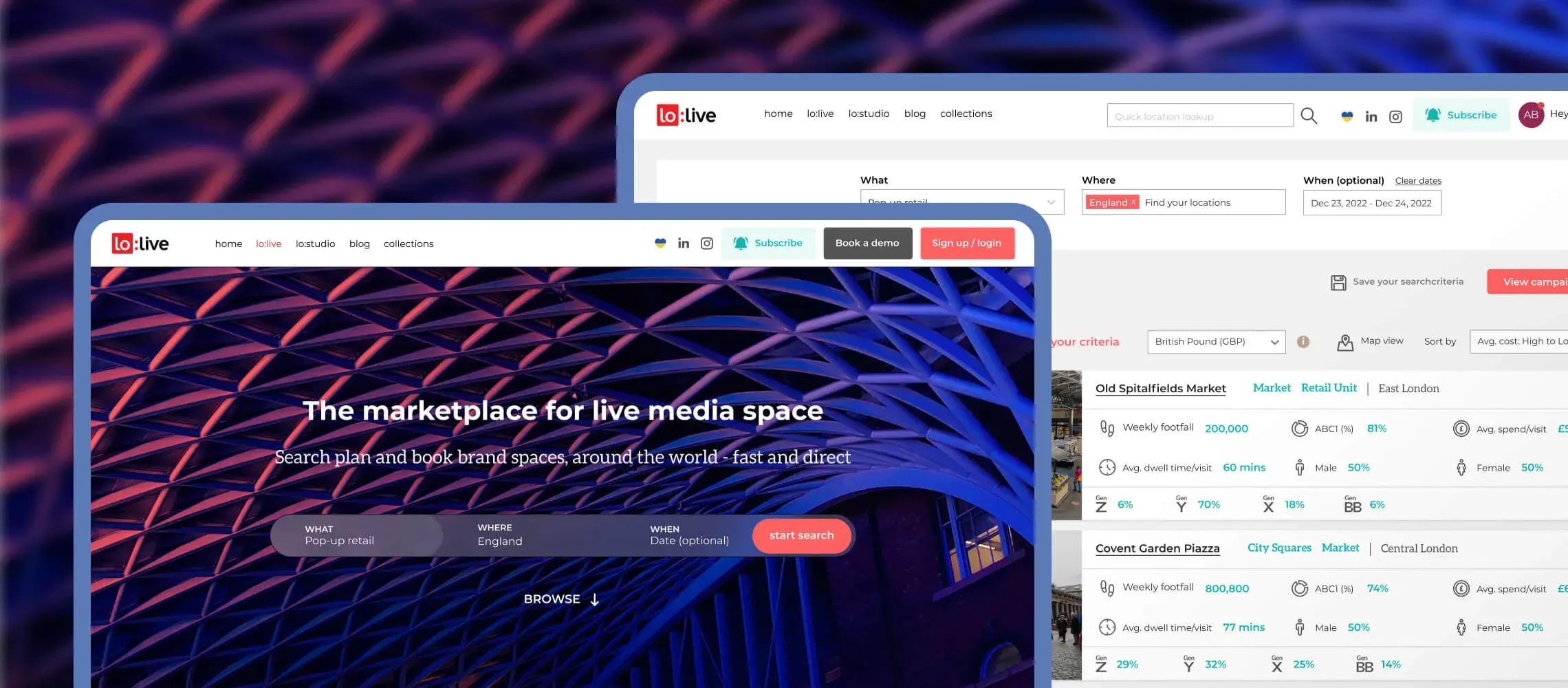 lo:live allows hirers to search a vast database of spaces; plan their marketing campaigns; reserve locations; and ultimately book their chosen spaces with ease.